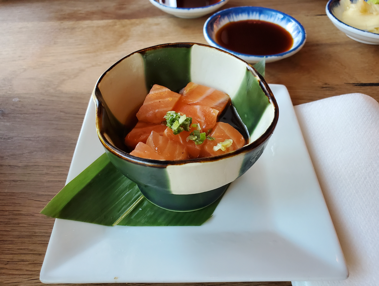 코스요리 첫 번째는 연어 사시미다. 우리가 아는 날것 그대로의 사시미가 아니라 직사면체 형태로 일본식 간장에 담겨서 나온다.
