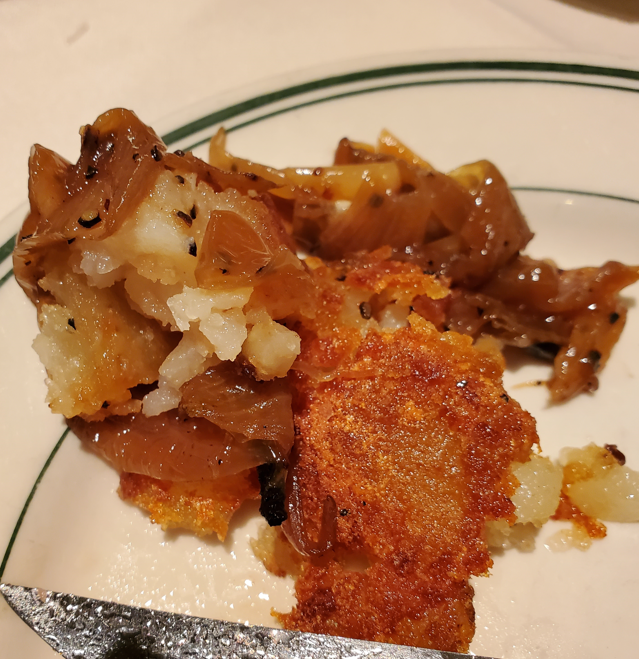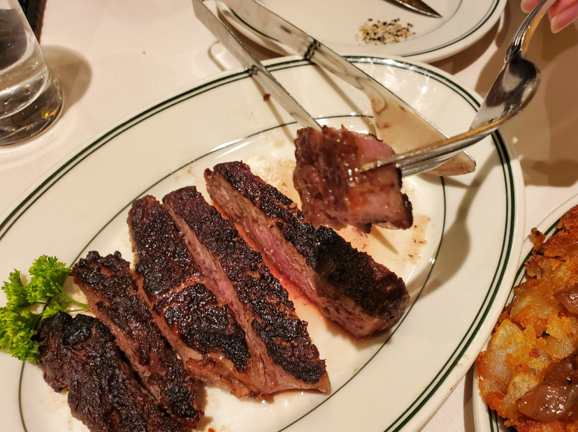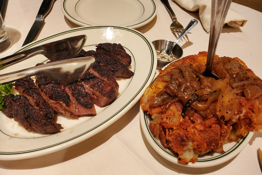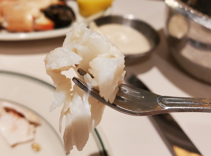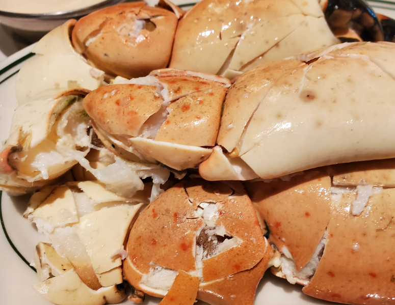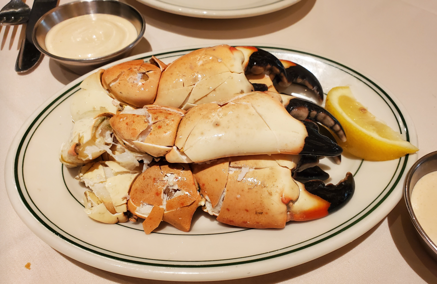 주문 메뉴: Marge Stone Crab(킹크랩), Rib Eye(스테이크), Lyonnaise(감자요리), Key Lime Cake(디저트)