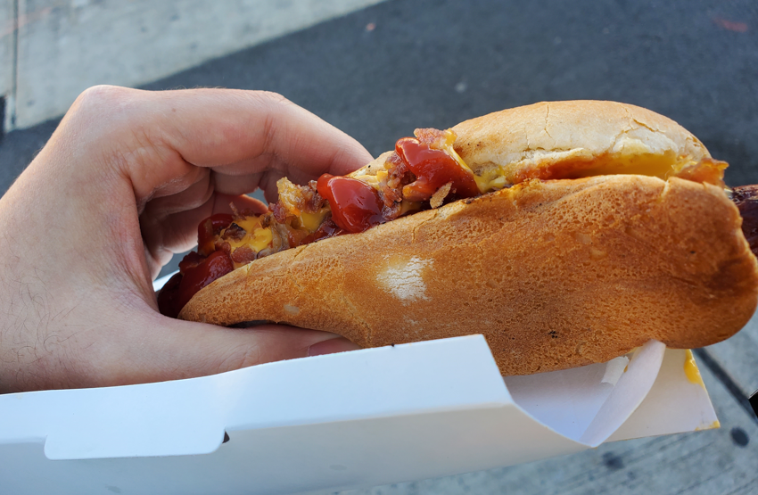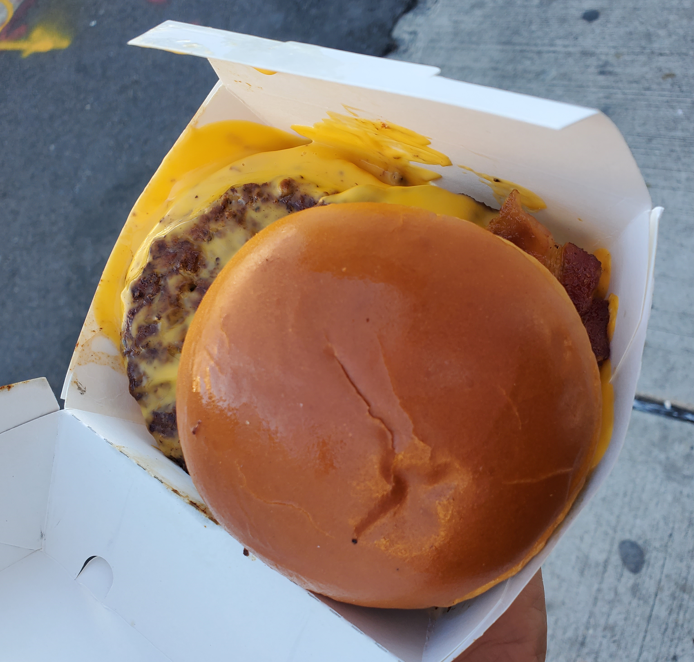 맨해튼과 물가 차이가 제법 많이 나서 적당히 가격이 높은 메뉴로 시켜도 얼마 안한다. 버거는 Bacon Cheddar Cheesy Burger(이름이 어렵다), 핫도그는 베이컨 핫도그. 가격은 둘 합쳐서 $15.