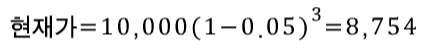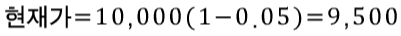 예시로, 5% 인플레이션(=할인율 5%)에서 이를 보상하기 위해 액면가 10,000원인 1년 만기채의 발행가로 얼마가 적절한지 구해보자. 액면가 = 1년 후 가격 = 미래가격 = 10,000 원이다.