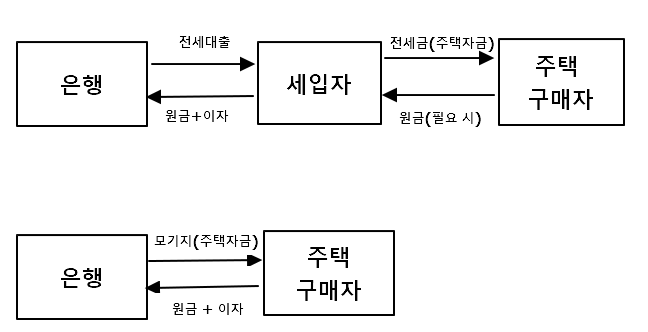 서브프라임 모기지를 설명하려면 먼저 모기지(Mortgage)가 무엇인지 부터 언급할 필요가 있을 것 같다. 모기지는 지금은 우리나라에도 꽤 알려진 상품이지만, 07년 당시에는 금융가 사람들이나 아는 상품이었다. 이유는 우리나라에만 있는 특이한 제도이자 무이자 대출의 일종인 "전세" 때문이다. 우선 두 방식의 구조부터 다시 확인해보면,