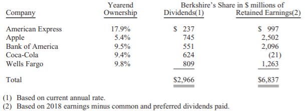 Our investees paid us dividends of $3.8 billion last year, a sum that will increase in 2019. Far more important than the dividends, though, are the huge earnings that are annually retained by these companies. Consider, as an indicator, these figures that cover only our five largest holdings.