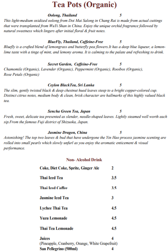 음료도 따로 메뉴판이 있다. 음식 메뉴판과 마찬가지로 목록이 상당히 길다. Thai tea는 너무 맛있으니 먹어볼 것을 권한다..