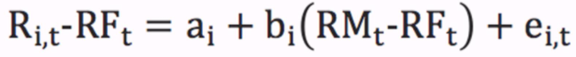 헤지펀드는 헤지(Hedge)전략을 활용하는 펀드다(;;). 무엇을 헤지하는가? 에 대한 질문에 대한 답은 운용사들마다 조금씩 다르지만, 공통적으로는 가격변동, 특히 지수의 오르내림에 따른 자산손실, 그리고 이득(!)까지 막기 위해 포트폴리오 전략에 헤지전략을 포함시킨다는 특징이 있다. 헤지전략의 목표는 지수 수익을 얻는 것이 아니다(뮤추얼 펀더들은 지수수익을 매우 좋아함). 흔히 알파(alpha)라고 불리는 (시장의 오르내림에 영향을 받지 않는)절대수익(별표 2개)을 얻는 전략을 만들고 운용하는 것이 헤지펀더들의 꿈이다. 당연히 시장 지수와는 수익률 곡선이 매우 달라진다. 구체적인 이해를 돕기 위해 알파를 측정하는 대표적인 회귀분석식인 CAPM model을 소개하면 다음과 같다.