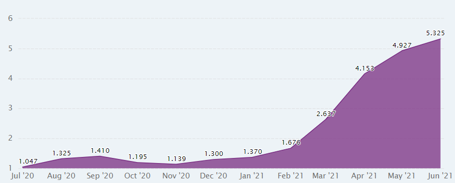 이제 취업자 수는 생각만큼 잘 늘어나지 않고 있고(실업 수당 청구가 더 이상 감소하지 않고 있다), 인플레이션은 생각보다 훨씬 급격해져서 매달 연준의 예상 발표치를 1%p씩 상회하고 있다. 당초에 3%가 넘지 않을 것이라던 인플레이션은 이미 5.4%를 찍었다. 6개월 전의 말들은 이제 무의미해졌다. 이젠 다시 4%대를 예상하노라고 정치적인 완곡어법(euphemism)을 구사해야 할 상황이다. 물론, 내일 아침엔 제발 상황이 진전되기를 바라는 행운의 주사위 돌리기일거라는걸 믿어 의심치 않는다.