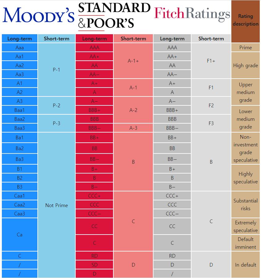 국채(그리고 다른 모든 채권)의 등급은 각 회사 별로 아래와 같이 매겨진다.
