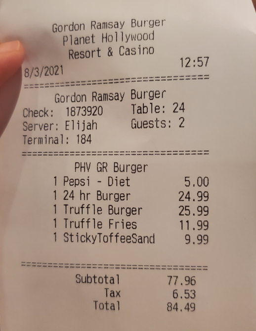 여행 일정 상 여러 번 먹을 수 없는 식당이기 때문에 그냥 Specialty로 갔다. 주문 메뉴는 (1) 24Hour Burger, (2) Truffle Burger(어느 블로그인지는 기억 안나지만 추천이 있었다), (3) Truffle Parmasan Fries, (4) Sticky Toffee Sandwich, 그리고 (5) 펩시콜라(펩시가 입찰을 잘 한 것 같다)였다.